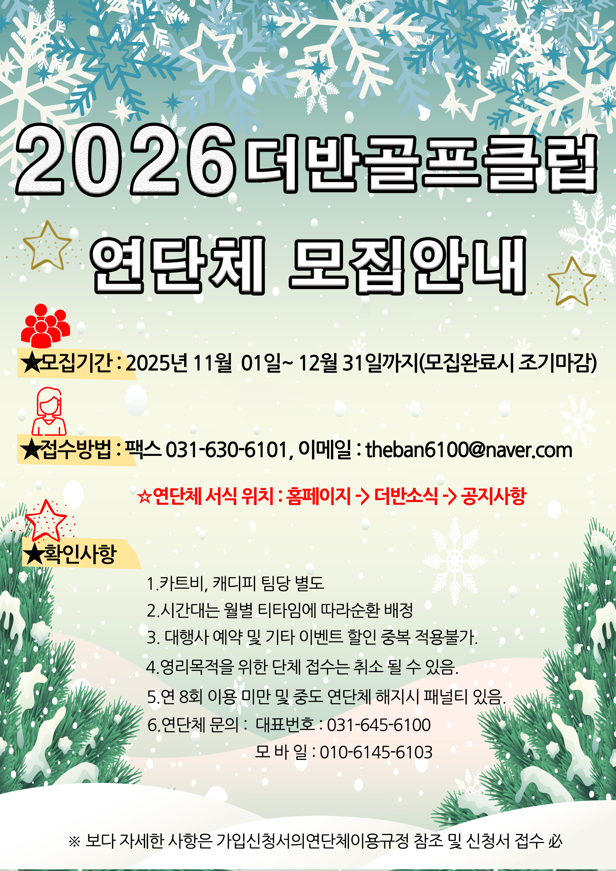2026년 더반골프클럽 연단체 모집. 작성자 : | 25-11-01 13:38 | 조회 652회 2026연단체신규신청서[5].hwp (32kb) 본문 더반골프클럽 2026년 연단체를 모집합니다. 첨부된 파일을 다운받으셔서 하단의 팩스 또는 이메일로 접수 부탁드리겠습니다. 목록